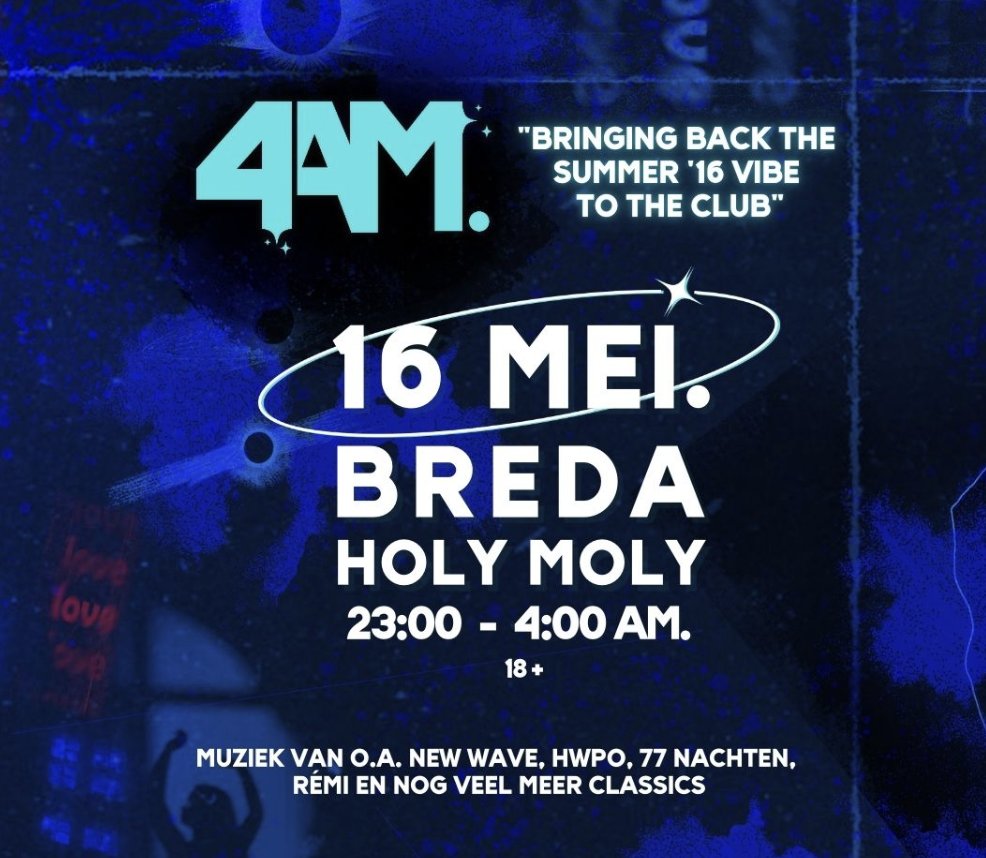 Het is zo ver, na een geweldige uitverkochte eerste in Breda is 4AM. op 16 mei weer terug in Holy Moly! Verwacht weer voor een nacht mee terug genomen te worden naar de gouden tijd van de Nederlandse hip-hop. 4AM. draait de nummers die iedereen uit volle borst mee kan zingen, denk hierbij aan albums als New Wave, 77 nachten, HWPO en nog veel meer throwbacks naar 2016-2018.