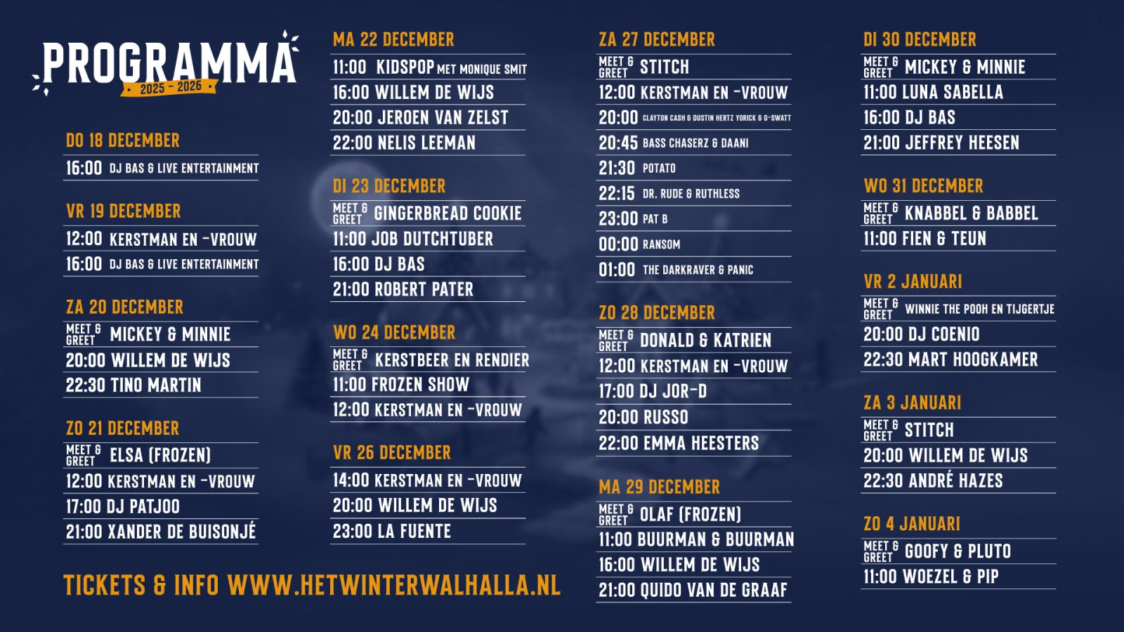 Overdag volop winterse activiteiten voor gezinnen, ’s avonds een bruisend feest met optredens en verrassende acts. Mis het niet en beleef samen een onvergetelijke winter!