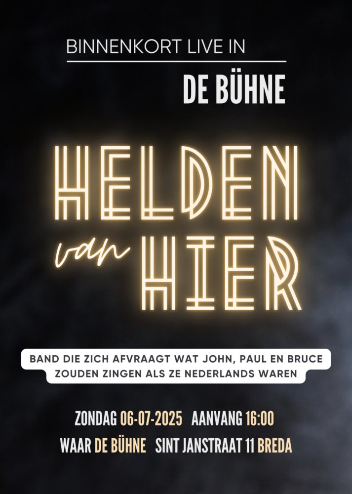 Band die zich afvraagt wat John, Paul & Bruce zouden zingen als ze Nederlands waren. PRAKTISCHE INFO Prijzen: vrije inloop, verzekerd zijn van een plekje? Reserveer een tafeltje. Datum: 6 juli 2025 Tijd: vanaf 16.00 Lees verder