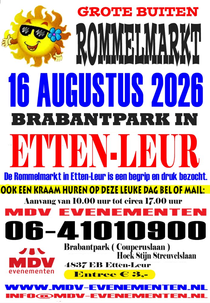 De Grote Buiten Rommel/Luikse Markt in het Brabantpark in Etten-Leur staat gepland voor zondag 16 augustus 2026. Organisatie: MDV-Evenementen.