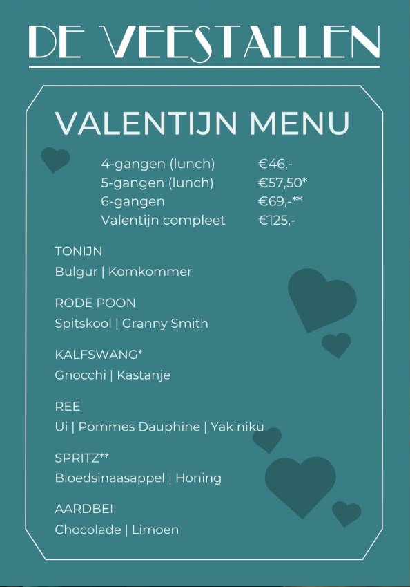 Vier de liefde met een culinair Valentijnsmenu bij Restaurant De Veestallen. Lees verder