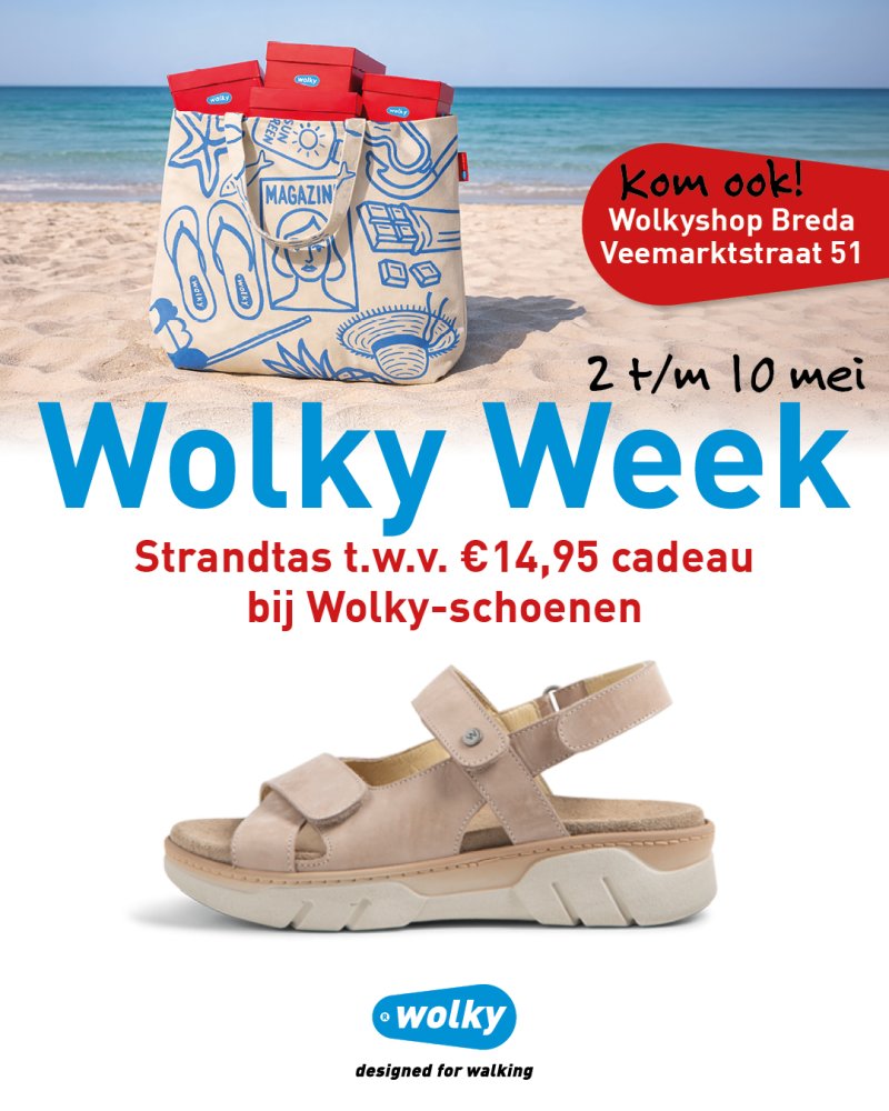 Van 2 t/m 10 mei is het Wolky Week! En dat betekent: extra leuk shoppen. Of je nu online shopt of binnenloopt bij de Wolkyshop in de Veemarktstraat ... bij jouw nieuwe Wolky's ontvang je nu een cadeau. Je krijgt een grote strandtas (t.w.v. €14,95) bij je aankoop.