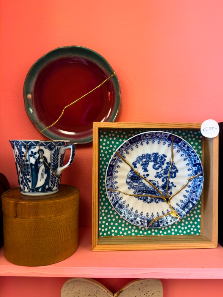 Het idee achter Lokaal 66 is even liefdevol als origineel: oude voorwerpen, popart, speelgoed en bijzondere spulletjes krijgen nieuw leven in de winkel, terwijl oude scherven juist mooi worden hersteld in het Kintsugi Atelier. De Japanse kunstvorm kintsugi, waarbij aardewerk wordt verbonden met goud of goudkleurige lak, zorgt ervoor dat reparaties worden benadrukt in plaats van verhuld. “Hier mag imperfectie gezien worden,” zegt de eigenares Annemarie.