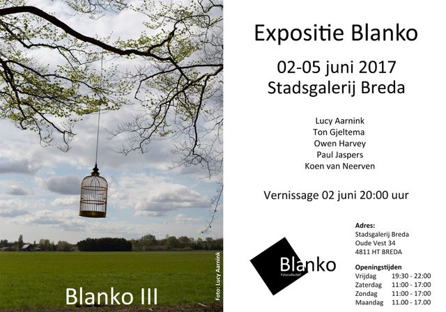 Fotocollectief Blanko uit Breda exposeert tijdens het pinksterweekend voor de derde keer in haar bestaan. Blanko is een fotocollectief waarin iedereen zijn eigen, autonome, weg volgt. Typisch Blanko is een sterk door inhoud gedreven onderzoekende houding. De fotografen (Lucy Aarnink, Ton Gjeltema, Owen Harvey, Paul Jaspers en Koen van Neerven) vormen samen een complementair geheel.