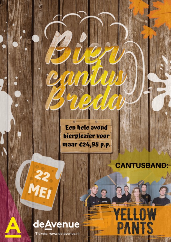 De Avenue presenteert samen met vele studenten- en studieverenigingen ‘Dé Bredase Biercantus’. Onder begeleiding van de cantusband ‘Yellow Pants’ zal er op woensdag 22 mei rijkelijk bier en stemgeluid vloeien.